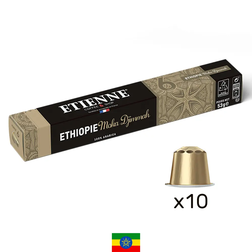 Le café de ces capsules ÉTHIOPIE Moka Djimmah, compatibles Nespresso® est 100% Arabica. Il se cultive à l’ouest de l’Éthiopie, c’est un café nature (méthode par voie sèche). Il représente près de la moitié des exportations.