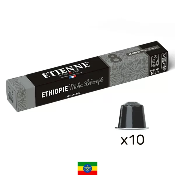 Le café de ces capsules d’Ethiopie Moka Lekempti, compatibles Nespresso®, est un café Arabica nature (méthode par voie sèche) de la région de Wellega en Éthiopie. C’est un café corsé aux arômes francs et délicats.
