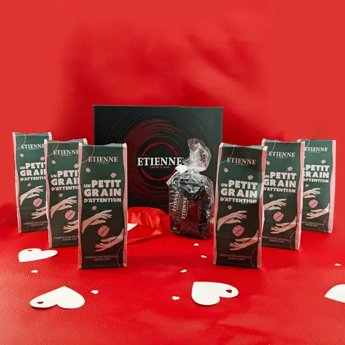 Ce coffret cadeau Grains d’Attention est une délicate sélection du savoir-faire de la Maison ETIENNE : 6 cafés fraîchement torréfiés à déguster accompagnés de biscuits speculoos croquants.
