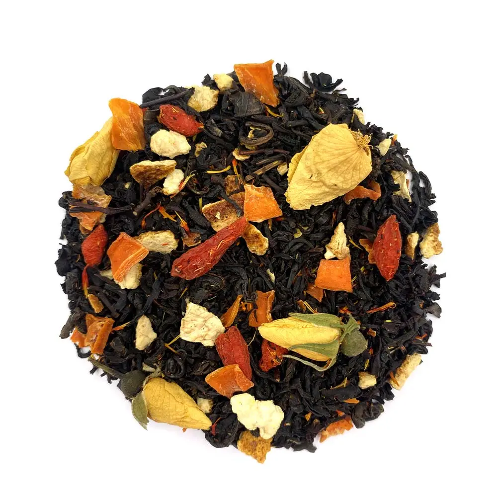 Thé noir de Chine, grenade, framboise, orange, baies de goji, rose, carthame
