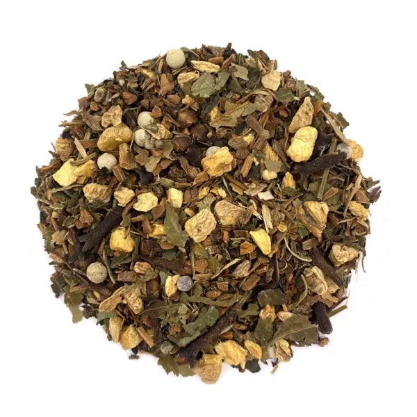 Cannelle, gingembre, clous de girofle, cardamome, baies de poivre blanc, feuilles d’ortie et de mûrier