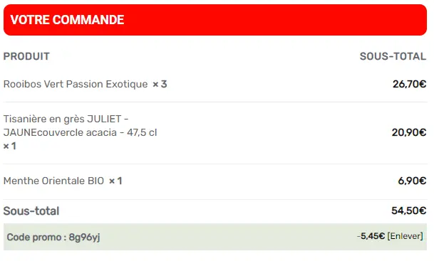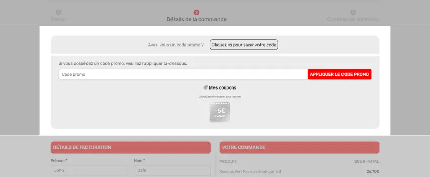 Dans le cas des codes promos issus directement du programme de fidélité, il sont listés sous forme de bouton, sous l’encart Code promo. Pour les activer, il suffit simplement de cliquer sur le coupon que vous voulez utiliser.