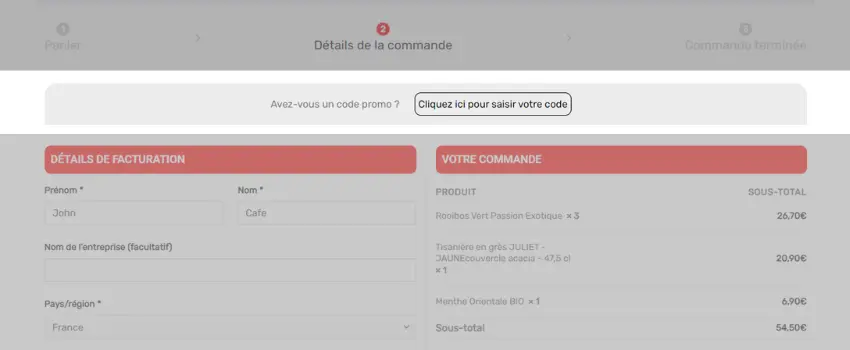 Ici un bandeau se situe en haut de la page. Il s’agit d’un bandeau « dépliant ». Cliquez sur le bouton Cliquez ici pour saisir votre code. Un nouvel encart semblable à celui de l’étape du panier apparait alors.