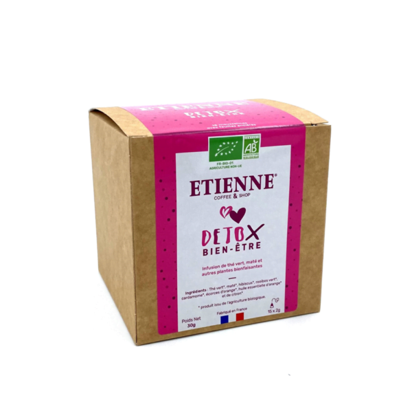 L’infusion Détox Bien-Être BIO est un mélange savoureux composé de thé vert, de maté, d’hibiscus, de rooibos vert, de cardamome, d’orange et de citron. Les ingrédients qui la composent sont issus de l’agriculture biologique. Cette infusion est idéale pour détoxifier l’organisme ! Cette boisson peut être consommée chaude ou en infusion froide.