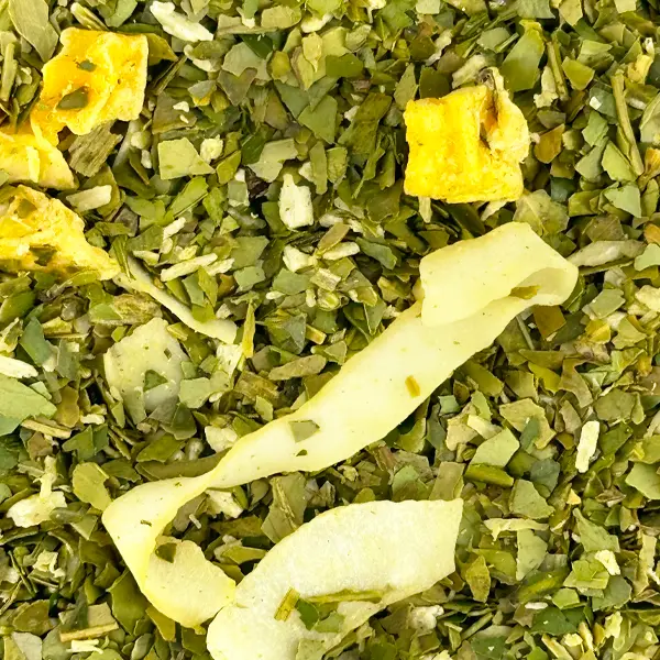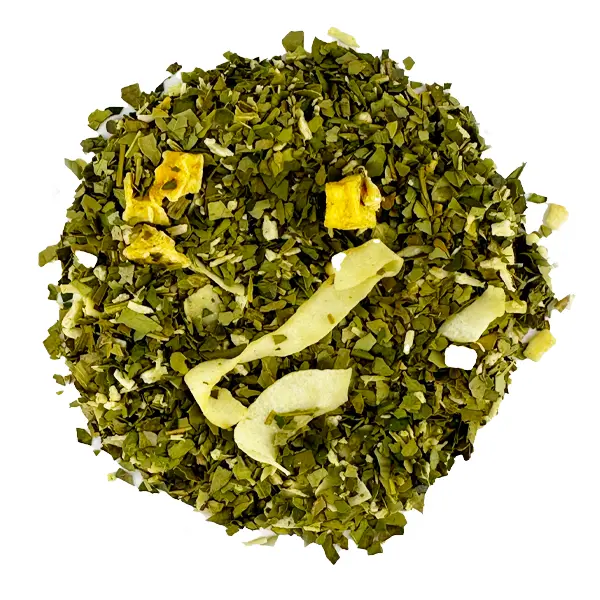 Maté du Brésil, copeaux de noix de coco, pépites de chocolat blanc (sucre, beurre de cacao, lait en poudre, dextrose, émulsifiant : lécithine de soja) (10 %), copeaux de noix de coco, morceaux de crème caramel (lait écrémé concentré sucré, sucre, sirop de glucose, matière grasse laitière, agent humidifiant : sorbitol, émulsifiant : mono- et diglycérides d’acides gras alimentaires), arôme, dés de mangue lyophilisés.
