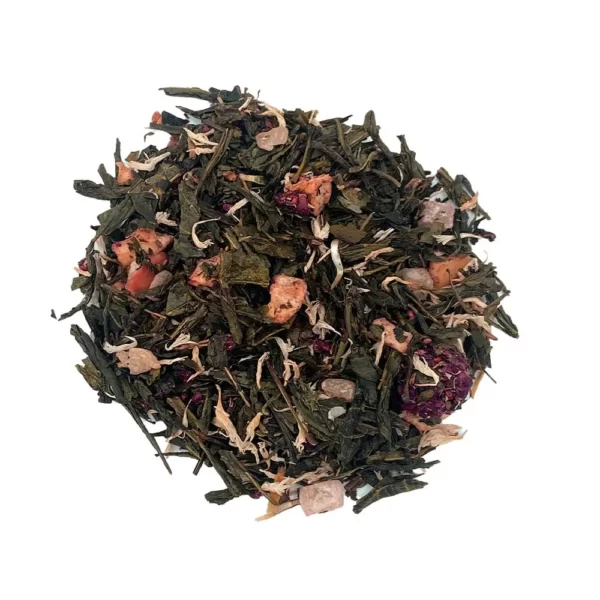 Le thé Muffin Framboise est un thé vert Sencha de Chine aromatisé à la framboise et à la crème. Il est parsemé de morceaux de pomme, d’ananas, de framboise et de fleurs de barbeau rose.