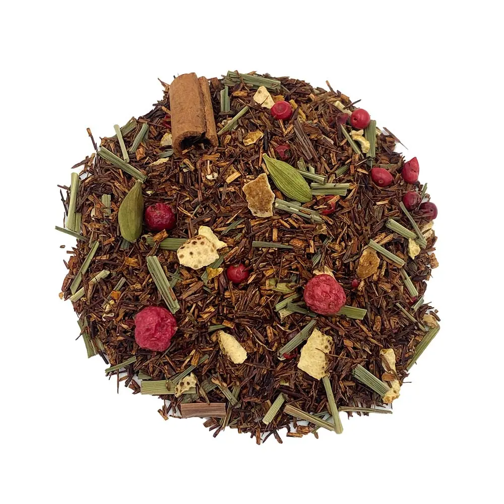 Rooibos d’Afrique du Sud, poivre, vanille, cannelle, citron, groseille, cardamome, poivre rose, écorces d’orange, citronnelle