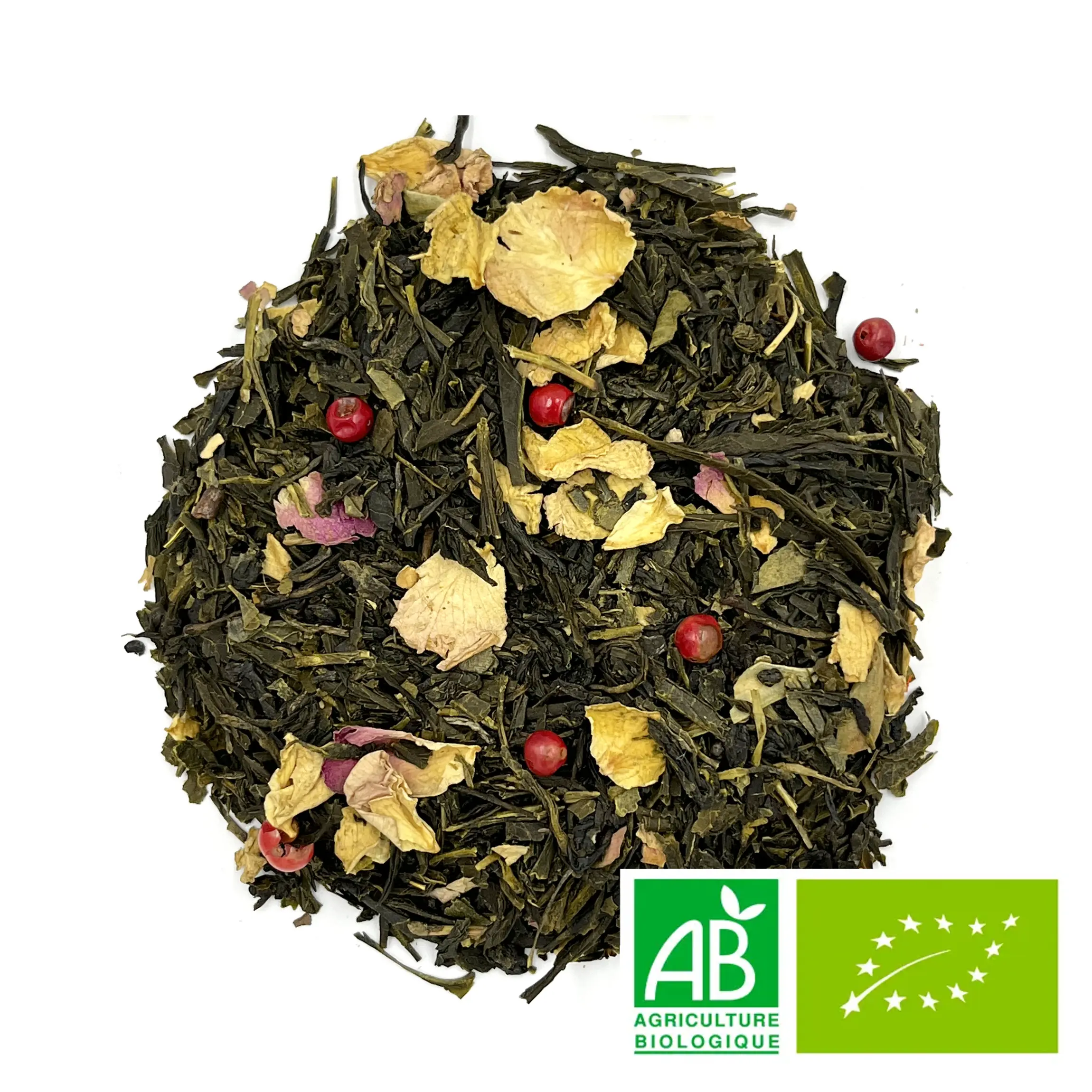 Thé vert de Chine, fruits des bois, rose, pétales de rose, baies roses