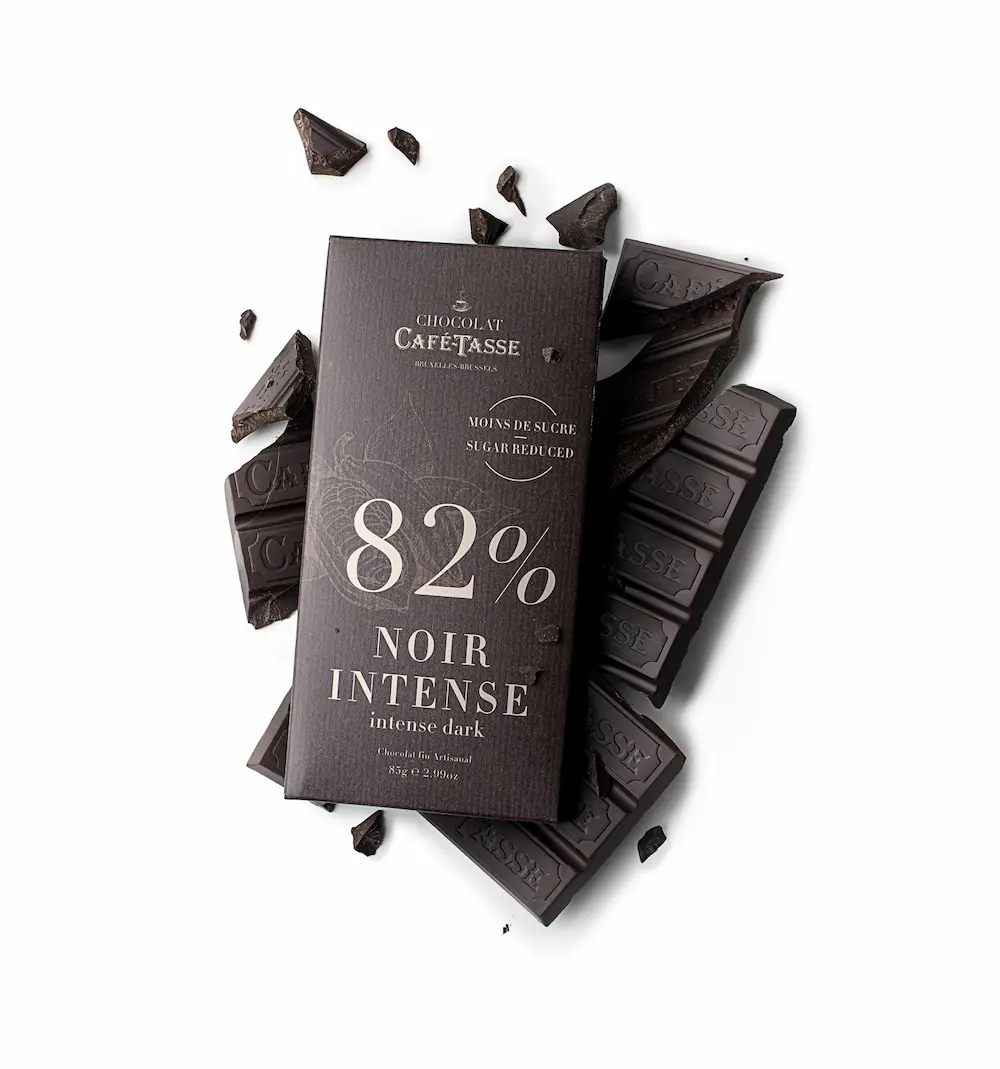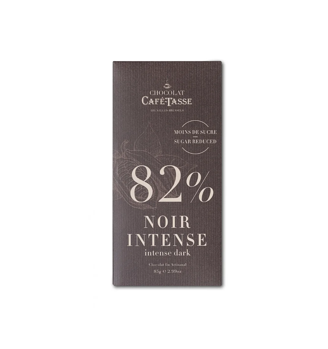Moins de sucre pour plus de plaisir cacao ! Cette tablette de chocolat noir 82% 🍫 avec peu de sucre est un vrai délice naturel signé du chocolatier belge “Café-Tasse”. Grâce à la Stevia, une plante 🪴 naturellement source d’édulcorants (au goût proche du sucre), vous pourrez profiter sans culpabiliser de toute l’intensité du chocolat Noir 82%. Pour se faire plaisir ou faire plaisir !