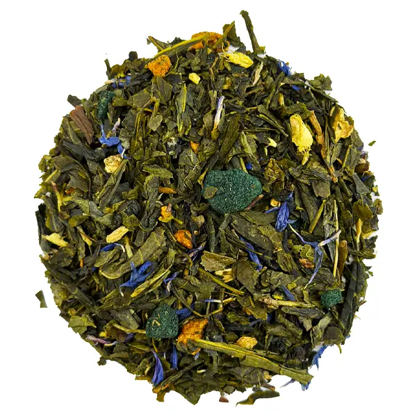 Mélange de thé vert, morceaux de gingembre, aloe-Vera confit, crunchy de yuzu, morceaux de pommes, spiruline, fleurs de bleuets.